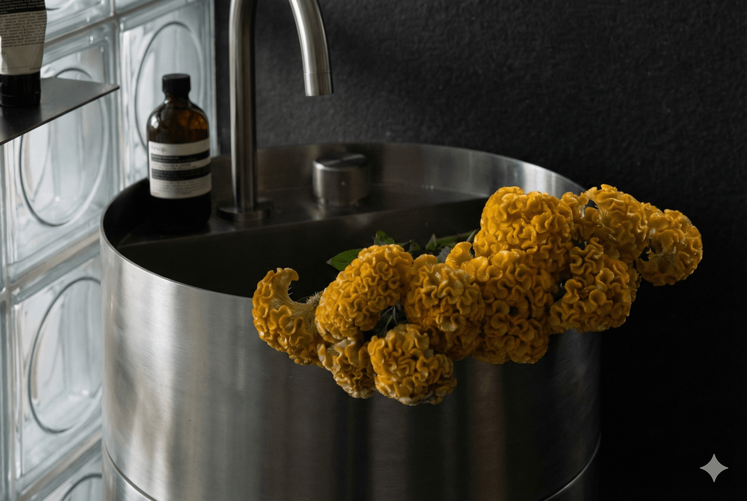 • Sculptural stainless elements, cylindrical geometry, minimalist lines